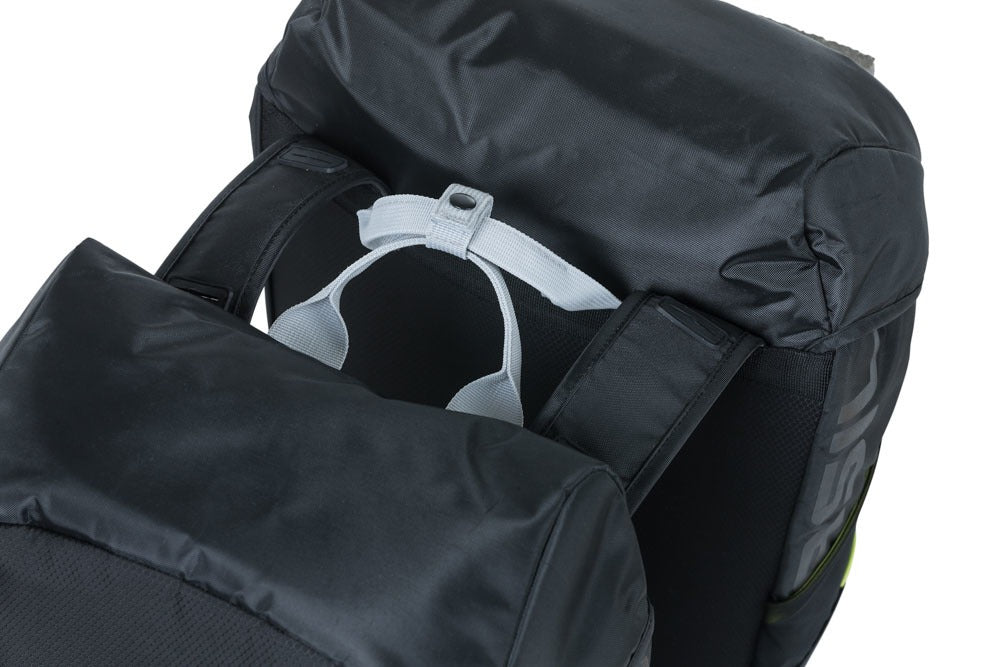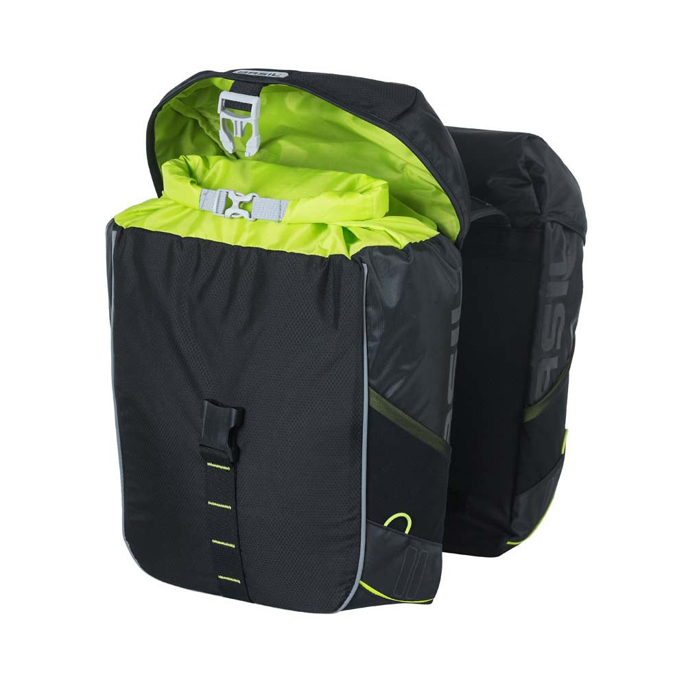 The Basil Miles Double Bag is a sporty choice of bicycle storage with a double-sized design that provides plenty of space. It features a capacity of 34 litres, superior construction and a sturdy inner lining. Made from hard-wearing polyester, this bag is built to last and helps keep the elements at bay with a waterproof finish. It includes reflective trims for increased visibility and space to fit extra LED lights. Easily closed with secure fastening, it can be attached to a luggage carrier via the Universal Bridge system (adapter for removable mounting sold separately) with user-friendly handles for carrying when off the bike.