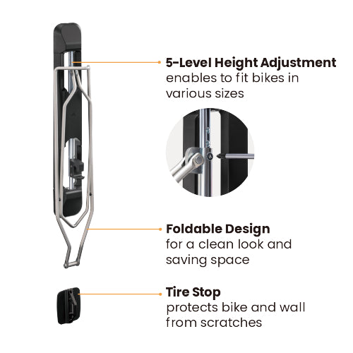 The BIKE RAKZ EZI FOLD wall-mounted Bike Rack is the perfect solution for anyone looking to store their bike on the wall. It offers a safer, simpler way to store your bike without it ever coming into contact with the wall. When not in use, you'll be able to free up valuable floor and storage space, making it the perfect choice for anyone who wants to declutter. In order to use the wall-mounted Bike Rack, simply roll your bike on to the rear wheel and guide into place. With the rack in contact with only the tyre, there is no risk of wear and tear or unsightly marking on your rims or frame, so you can enjoy an effortless, safe and secure solution for keeping your bike stored away.