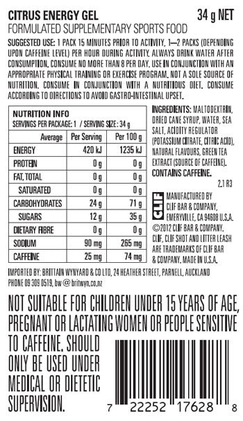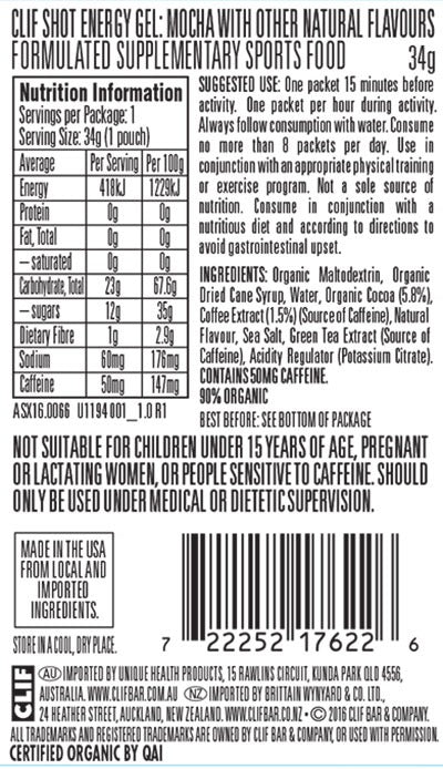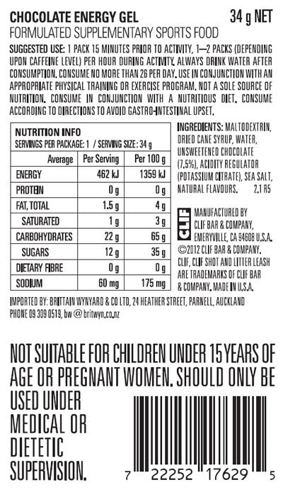 The tempting taste of chocolate flavour and coffee gets a kick of caffeine for a deliciously dynamic duo. CLIF SHOT offers simple carbohydrates for athletes during activity. Not recommended for children or pregnant women. (52.3 mg caffeine per recommended daily dose.)