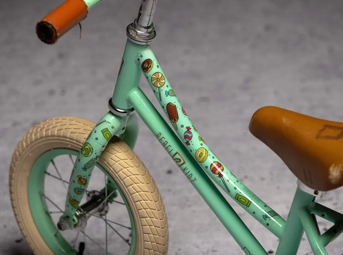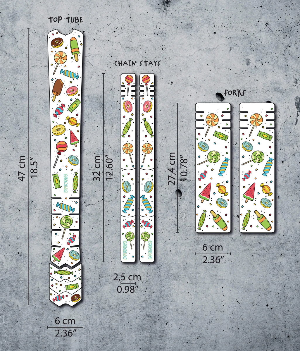An all new frame protection kit just for little shredders. Kids bikes take just as much abuse as other bikes so it makes sense to protect them well. Candy features a heap of treats and contains top tube, chainstay and fork sections.