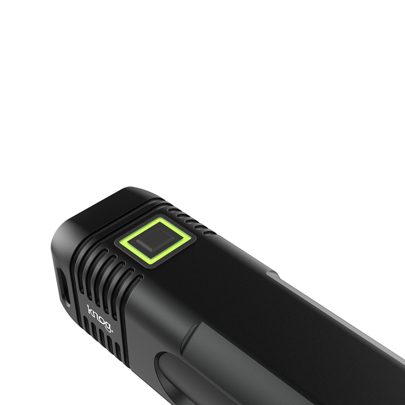 An LED light around Blinder's soft touch silicone button allows you to quickly see remaining charge and the charging status. A quick press of the button when it's off shows you remaining charge, with green being 100-50% charge remaining, yellow 50-25%, and red under 25%. When charging, a yellow flash indicates the light is being charged, which turns green when full.