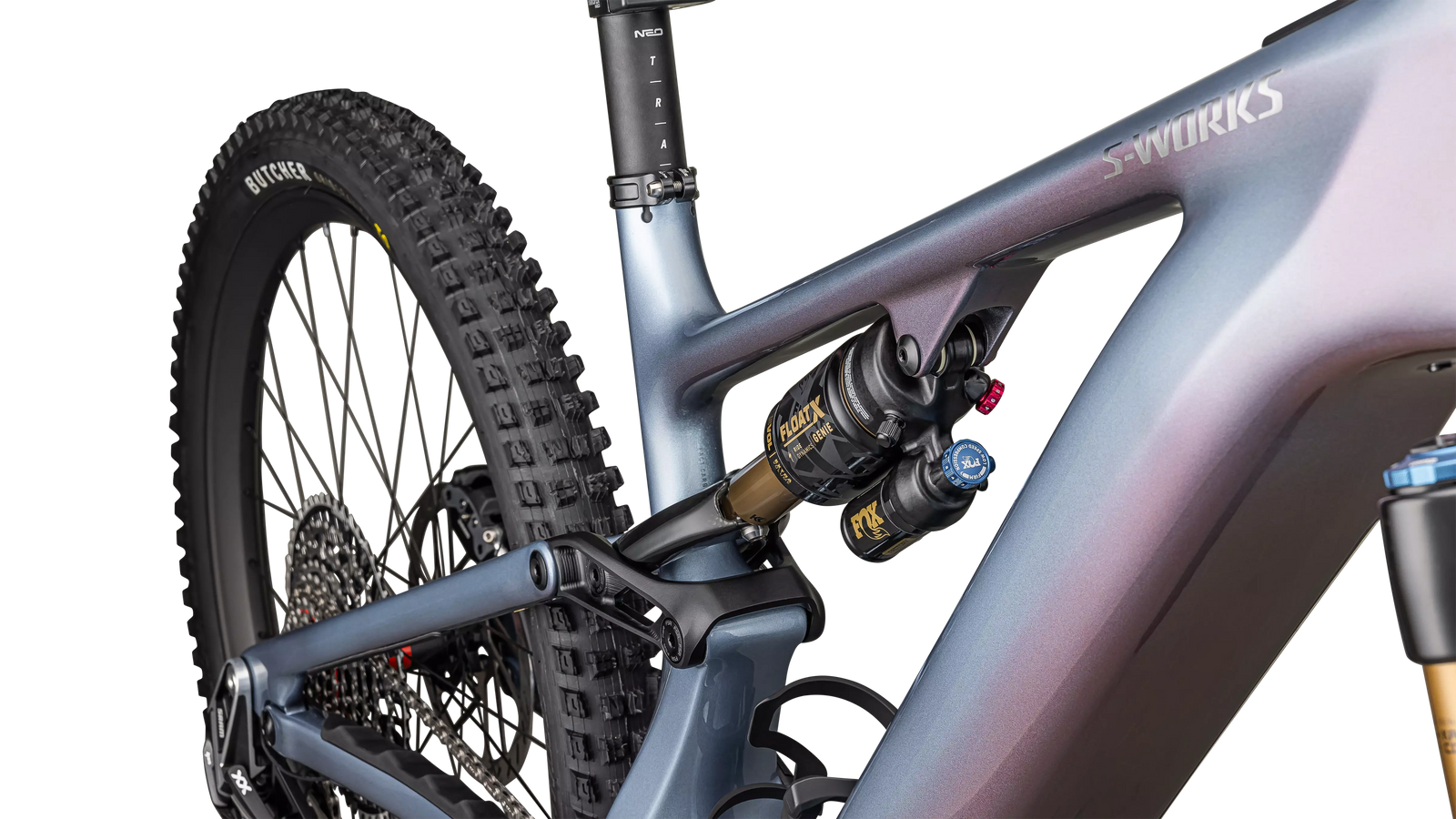 Frame: All new S-Works Levo 4 frame with carbon shock extension, FACT 11m carbon chassis and rear-end, 12x148mm dropouts, sealed cartridge bearing pivots, SRAM UDH compatible, w/ SWAT storage, 150mm of travel, side entry battery, fork travel up to 180mm