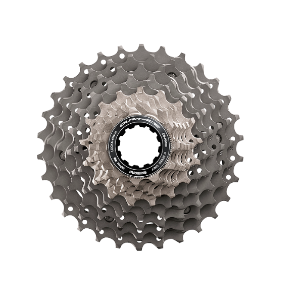 The Dura Ace cassette is manufactured from a lightweight alloy and carbon fibre spider that houses 6 alloy sprockets and 5 titanium sprockets. The largest sprockets are manufactured from titanium to keep the weight low. The sprockets are also extensively cut away and drilled to further reduce weight without reducing rigidity.