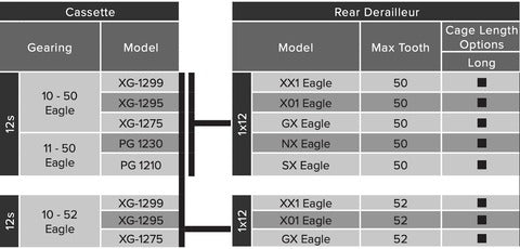 10-50t: 10t, 12t, 14t, 16t, 18t, 21t, 24t, 28t, 32t, 36t, 42t, 50t 10-52t: 10t, 12t, 14t, 16t, 18t, 21t, 24t, 28t, 32t, 36t, 42t, 52t (Not compatible with all Eagle derailleurs) |